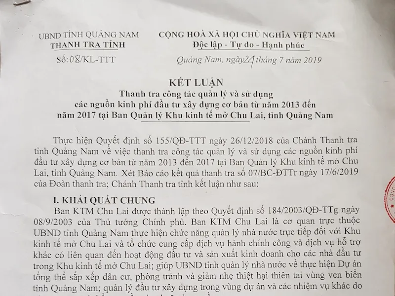 Ngày 30-9, ông Trần Minh Thái, Chánh Thanh tra tỉnh Quảng Nam, đã ký kết luận thanh tra về công tác quản lý và sử dụng các nguồn kinh phí đầu tư xây dựng cơ bản từ năm 2013-2017 tại Ban quản lý Khu kinh tế mở Chu Lai (gọi tắt là KKT Chu Lai), tỉnh Quảng Nam.
