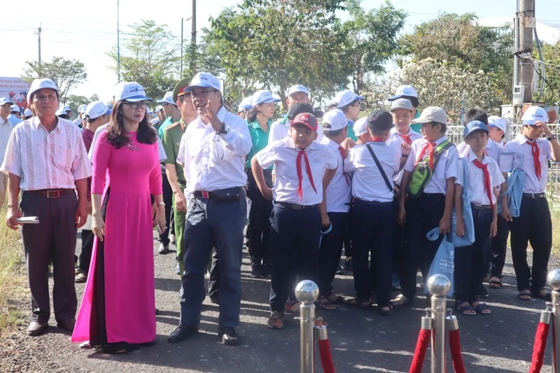 Lãnh đạo sở TN&MT và bà Lê Thị Trang Đài, Chủ tịch huyện Xuyên Mộc, cùng các học sinh đi bộ tuyên truyền về việc bảo vệ các hồ chứa nước.