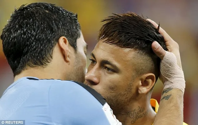 Hai người đồng đội trong màu áo Barcelona Neymar và Suarez ôm nhau trước trận đấu