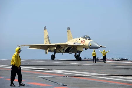 Một máy bay chiến đấu J-15 trên tàu sân bay Liêu Ninh