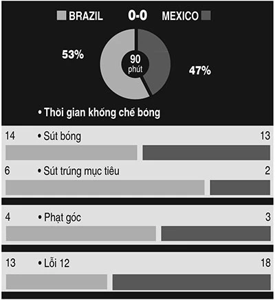 Chủ nhà đã tấn công thật đa dạng bao gồm cả trung lộ, biên lẫn những miếng đánh chọc khe thẳng trung lộ và cả bóng bổng treo từ hai biên vào. Cả đánh đầu lẫn sút xa đều được các cầu thủ Brazil tận dụng trong 90 phút nhưng không sao có được bàn thắng.