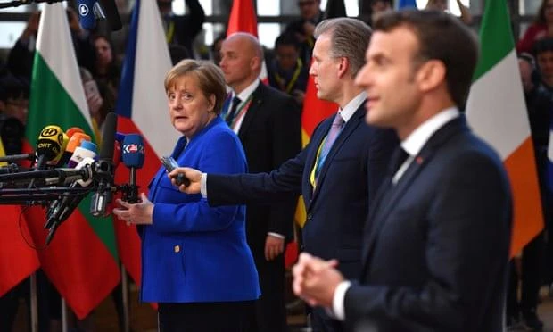 Thủ tướng Đức Angela Merkel (trái) và Tổng thống Pháp Emmanuel Macron (bìa phải) phát biểu trước thềm hội nghị EU27 ngày 10-4. Ảnh: The Guardian