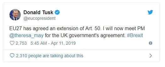 Twitter của Chủ tịch Hội đồng châu Âu Donald Tusk cho biết Hội nghị thượng đỉnh EU27 đã đồng ý gia hạn điều 50 Hiệp ước Lisbon, gia hạn thời điểm Brexit tới tháng 10-2019. Ảnh: The Guardian