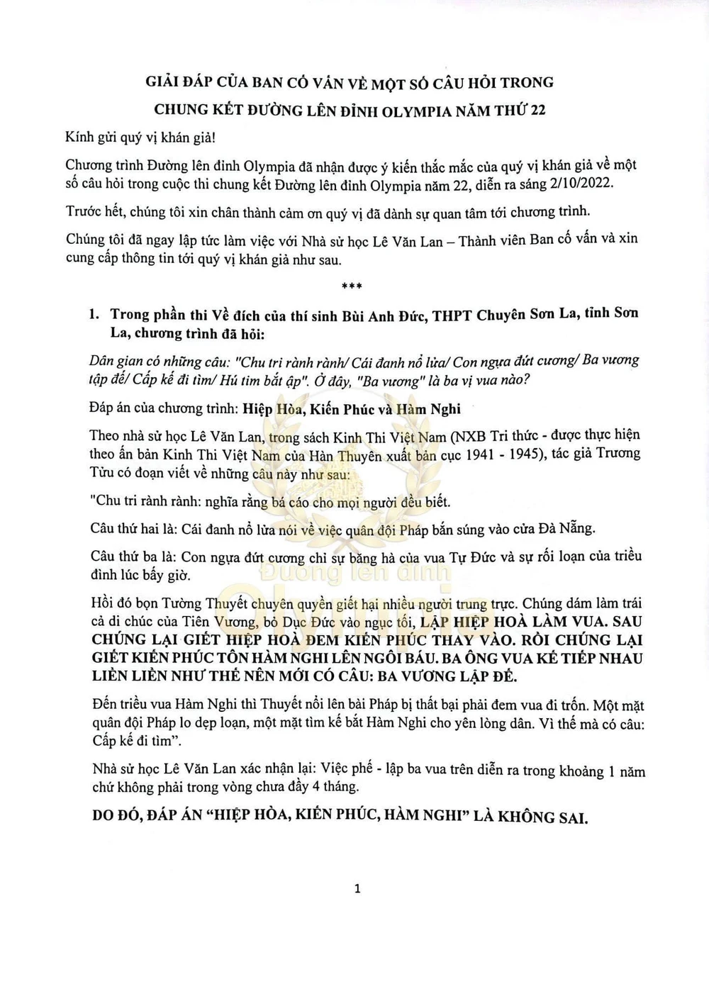 Nguyên văn văn bản giải đáp thắc mắc của BTC Đường lên đỉnh Olympia 2022. Ảnh: BTC. |
