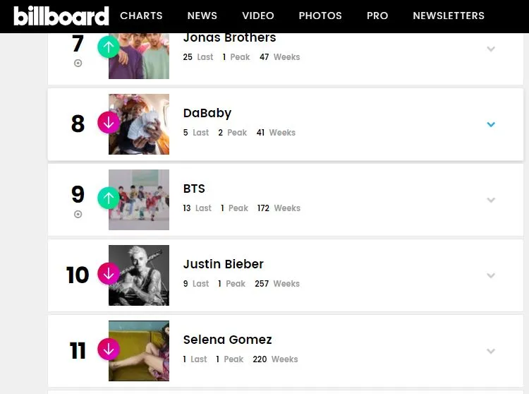 Justin Bieber trước đây đã phá vỡ kỷ lục với 164 tuần ở vị trí số 1 trên bảng xếp hạng Social 50 của Billboard nhưng cuối cùng BTS đã vượt qua Justin vì hiện tại nhóm đã đạt 165 tuần ở vị trí cao nhất.
