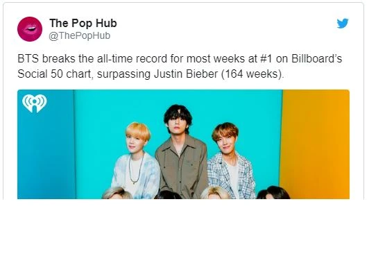 Pop Hub đã đăng lên tài khoản Twitter của họ rằng: "BTS đã phá vỡ kỷ lục mọi thời đại trong hầu hết các tuần ở vị trí hàng đầu trên bảng xếp hạng Social 50 của Billboard, vượt qua ca sĩ Justin Bieber (164 tuần).