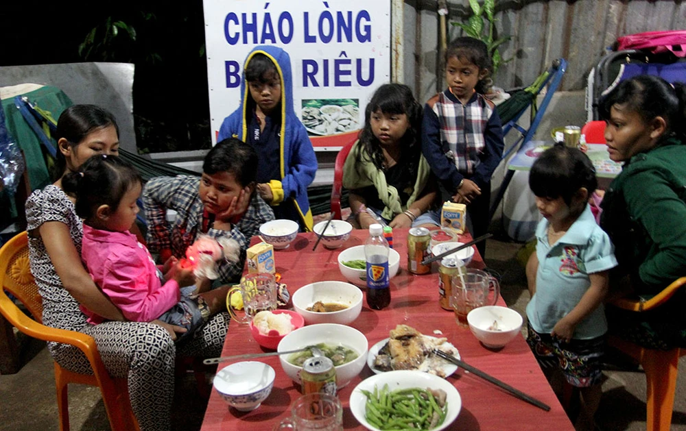 Bữa cơm thân tình của hai gia đình, họ vừa ăn vừa trò chuyện. Ảnh: HOÀNG GIANG