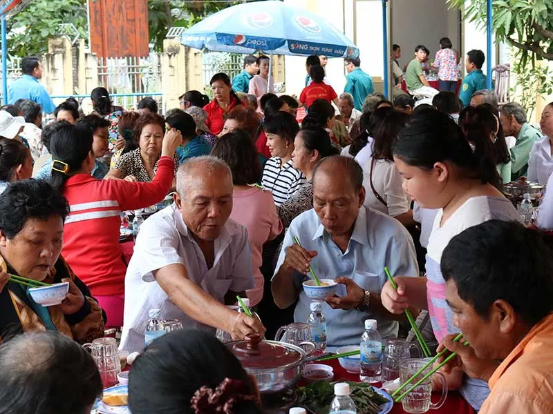 Tay vừa gắp thức ăn, bà Nguyễn Thị Tuội (76 tuổi) quay sang nói với người bạn ngồi bên: “Bà ăn có thấy ngon miệng không đó? Tôi thì thấy ngon quá xá nè. Ngon vì tấm lòng của người nấu, người tổ chức bà hen”. Nói rồi hai người cùng nhìn nhau cười.