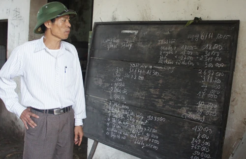 Ông Nguyễn Thế Tường, Phó Giám đốc Trung tâm Bảo trợ xã hội Nghệ An bên chiếc bảng niêm yết công khai giả cả, thực phẩm... tại nhà bếp của trung tâm.