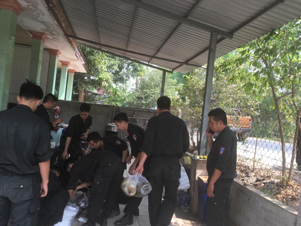 Bữa cơm vội của các CSCĐ tại hiện trường. Ảnh: N.YÊN