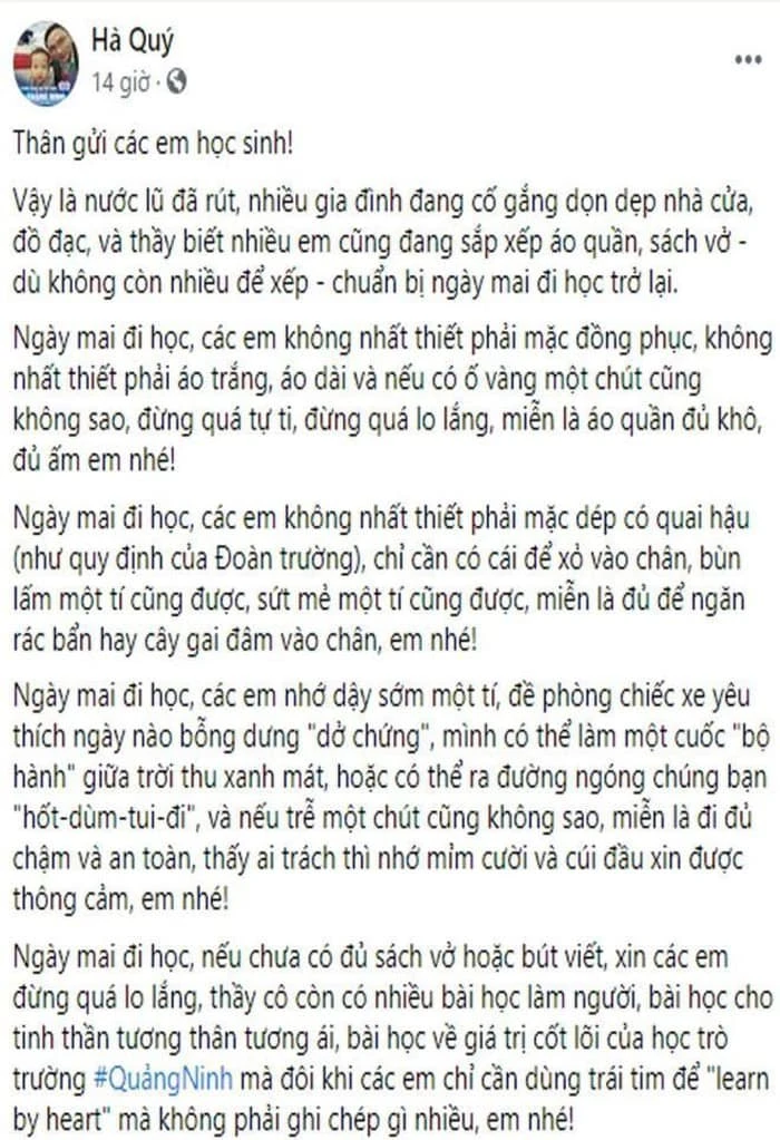"Ngày mai đi học, các em nhớ dậy sớm một tí, đề phòng chiếc xe yêu thích ngày nào bỗng dưng "dở chứng", mình có thể làm một cuốc "bộ hành" giữa trời thu xanh mát, hoặc có thể ra đường ngóng chúng bạn "hốt-dùm-tui-đi", và nếu trễ một chút cũng không sao, miễn là đi đủ chậm và an toàn, thấy ai trách thì nhớ mỉm cười và cúi đầu xin được thông cảm, em nhé! Ngày mai đi học, nếu chưa có đủ sách vở hoặc bút viết, xin các em đừng quá lo lắng, thầy cô còn có nhiều bài học làm người, bài học cho tinh thần tương thân tương ái, bài học về giá trị cốt lõi của học trò trường Quảng Ninh mà đôi khi các em chỉ cần dùng trái tim để "learn by heart" mà không phải ghi chép gì nhiều, em nhé!", thầy Quý viết.