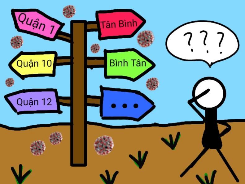 Bức tranh thứ nhất vẽ một người đang chọn điểm đến để thăm bạn bè, họ hàng trong dịp Tết Nguyên đán 2021. Tuy nhiên, do nhiều địa phương đang có ca bệnh COVID-19 như các quận 1, 10, 12, Tân Bình, Bình Tân… nên người này lưỡng lự không biết đi đâu, liên tục gãi đầu gãi tai.