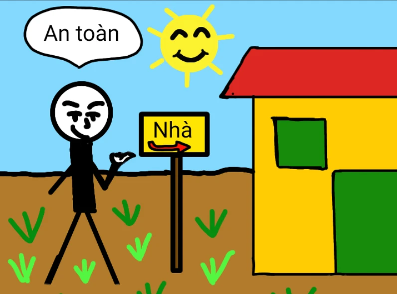 Bức tranh thứ hai, cũng nhân vật này với gương mặt hớn hở bước vào nhà mang theo suy nghĩ: “Ở nhà là an toàn”. Bức tranh vẽ kèm ông mặt trời cười tươi với hàm ý đồng thuận sự lựa chọn đúng đắn của nhân vật.