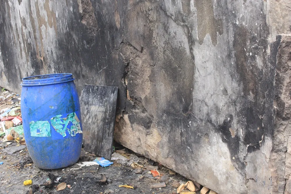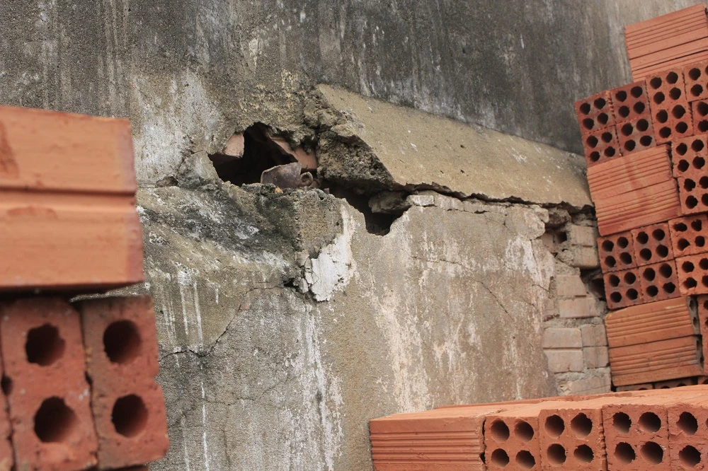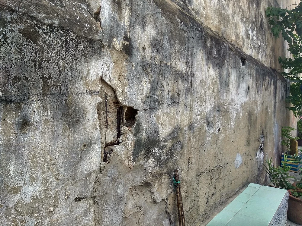 Bờ tường đang xuống cấp với nhiều vết nứt và được trám vá tạm bợ