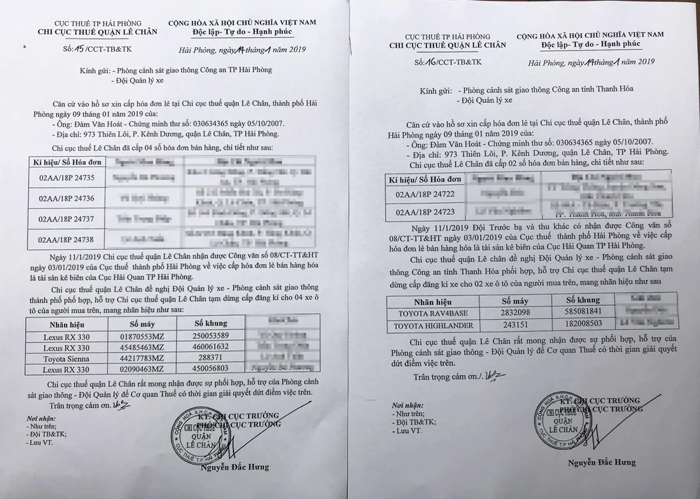 Cùng ngày, Chi cục thuế quận Lê Chân cũng có văn bản đề nghị Phòng CSGT Công an tỉnh Thanh Hoá tạm dừng cấp đăng ký cho hai xe Toyota Rav4 và Hilander của ông NĐ và LVN (trú tỉnh Thanh Hoá) với lý do tương tự.