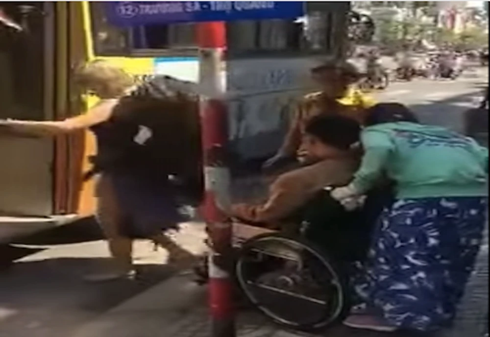 Hình ảnh trong clip cho thấy, khi người khuyết tật ngồi xe lăn được một phụ nữ chuẩn bị đẩy lên xe buýt thì bị tài xế và nhân viên xe từ chối chở. Trong khi đó, xe buýt vẫn nhận chở khách với nhiều hàng hóa cồng kềnh.
