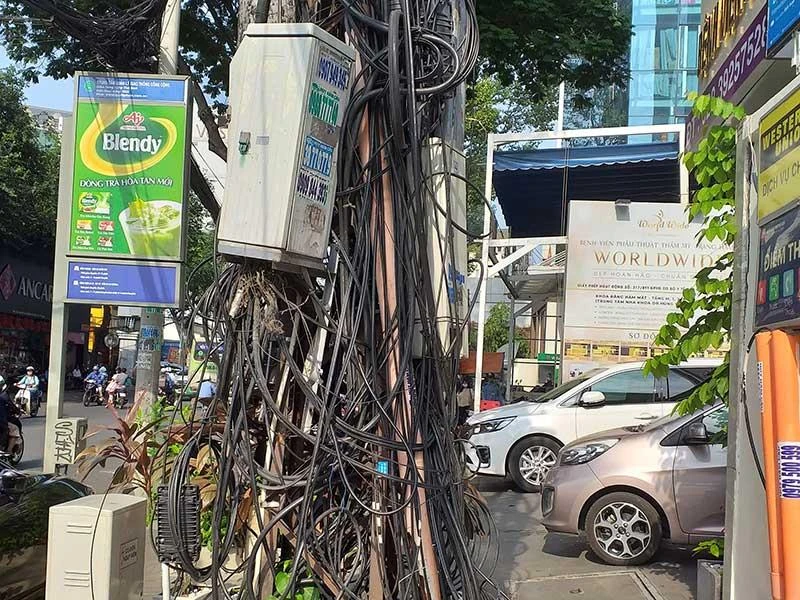 Việc để những búi dây, sợi dây điện loằng ngoằng trên vỉa hè như vậy là không ổn chút nào, bởi nếu xảy ra sự cố rò rỉ điện thì khách bộ hành sẽ là những người phải chịu hậu quả khi vướng phải...