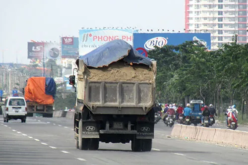 Nhiều xe ben hạng nặng chở đất, cát nhưng không che đậy khiến vật liệu rơi vãi xuống mặt đường. Các cây xanh dọc đường song hành đều biến thành màu trắng đục.