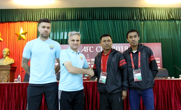 HLV Marian Mihail và Putro Widodo bắt tay tại họp báo trước trận.
