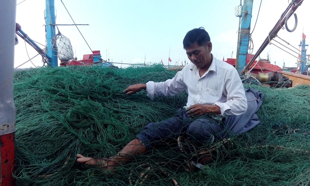 Ngư dân Bùi Xuân Tấn đang sửa soạn lại ngư cụ bị hư hại. Ảnh: NGUYỄN DO