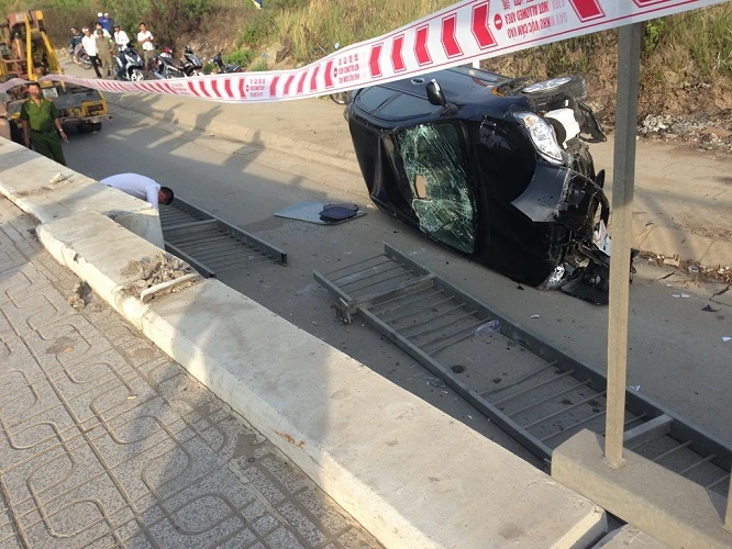 Chiếc xe bị lật nghiêng, hư hại, móp méo hết phần đầu