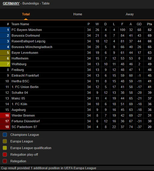 Theo đó, trước vòng 34 Bundesliga, hai CLB Bayern Munich (79 điểm) và Borrusia Dortmund (69 điểm) đã chắc suất tham dự Champions League. CLB Leipzig đang đứng thứ ba (63 điểm) cũng gần như chắc chắn có suất đá Champions League mùa sau. Bởi Leipzig hơn đội xếp thứ năm Bayer Leverkusen 3 điểm và có hiệu số rất cao (+43 so với +16).