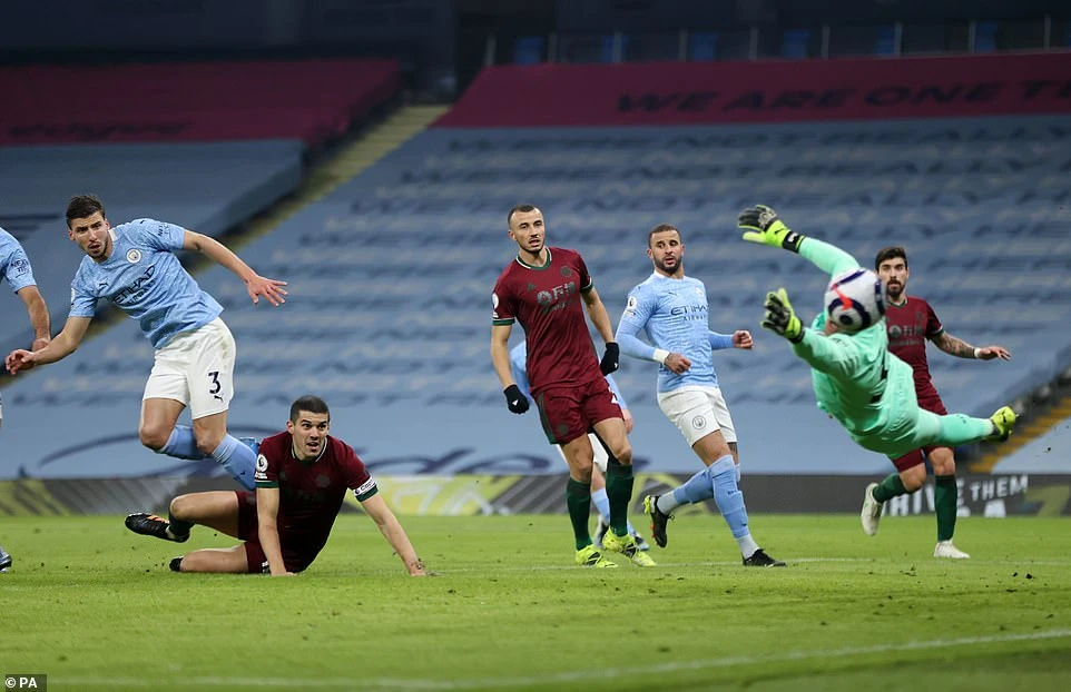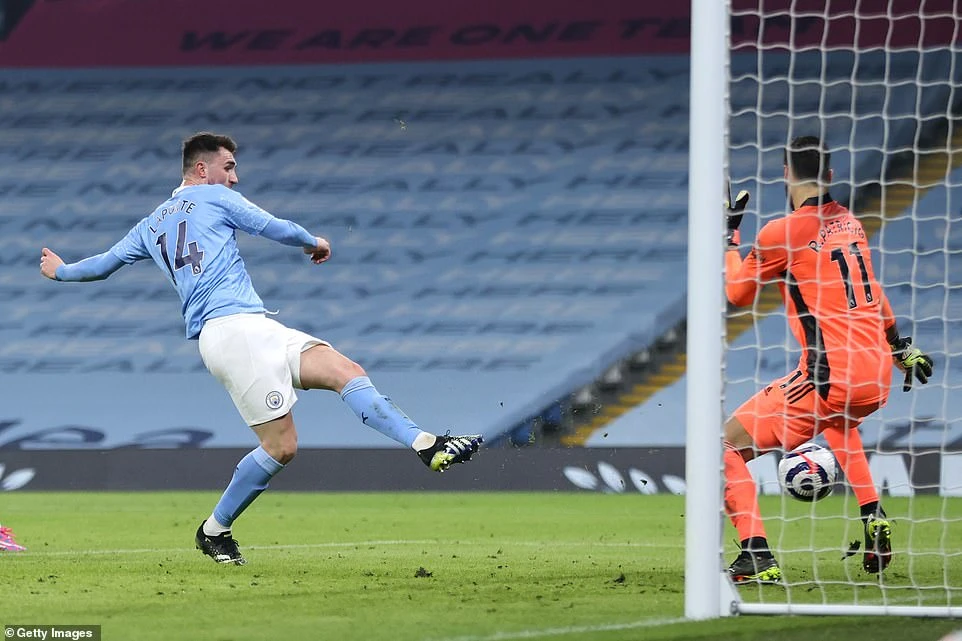 Cuối hiệp một, Laporte làm rung lưới Wolves với pha đệm bóng cận thành, tuy nhiên bàn thắng này không được công nhận. Ảnh: Getty Images.