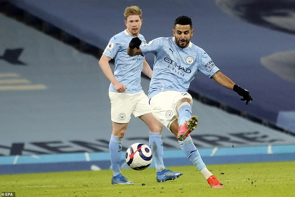 Bàn thắng phút 90 của Mahrez...Ảnh: EPA.