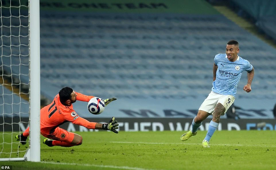 Phút 77, Sterling có pha cứa lòng trước vòng cấm, nhưng tiếc là cột dọc khung thành đã từ chối siêu phẩm của tiền đạo người Anh. Đến phút 80, Man. City mới lấy lại thế trận dẫn bàn bằng bàn thắng nâng tỷ số lên 2-1 do công của Grabiel Jesus. Từ đường căng ngang của của hậu vệ Walker, hàng thủ của Wolves lui về quá đà để cản phá, ngay phía sau Jesus dứt điểm cận thành, giúp Man. City lấy lại thế dẫn bàn.