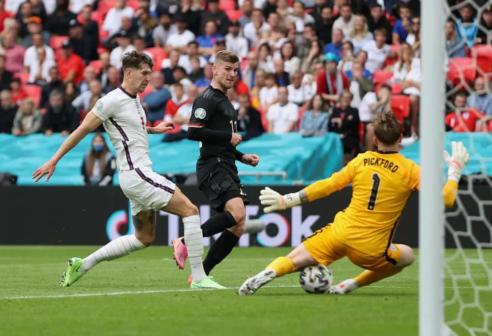 Đến phut 32, tuyển Đức có cơ hội mở tỷ số với đường chọc khe của Kai Havertz cho Timo Werner thoát xuống, nhưng cú sút của Werner không thể thành bàn bởi thủ môn Pickford đã kịp cản phá.