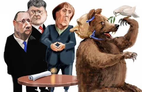EU tố Nga vừa đánh vừa đàm ở Ukraine trong khi Nga bác bỏ cáo buộc này. Ảnh: Biếm họa của RIBER HANSSON (báo Sydsvenskan của Thụy Điển)