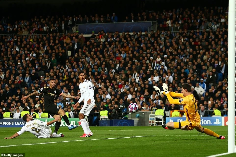 Real Madrid được thi đấu trên sân nhà Bernabeu ở trận lượt đi, thế nhưng đội có được thế trận tốt hơn ngay sau tiếng còi khai cuộc lại là đội khách Man. City. Phút 21, Man. City có cơ hội mở tỉ số sau khi Kevin De Bruyne có đường kiến tạo vừa tầm để cho Grabiel Jesus tung cú dứt điểm ở cự ly gần. May cho Real ở pha bóng này, thủ môn Courtois đã phản xạ kịp thời để cứu cho đội nhà bàn thua.