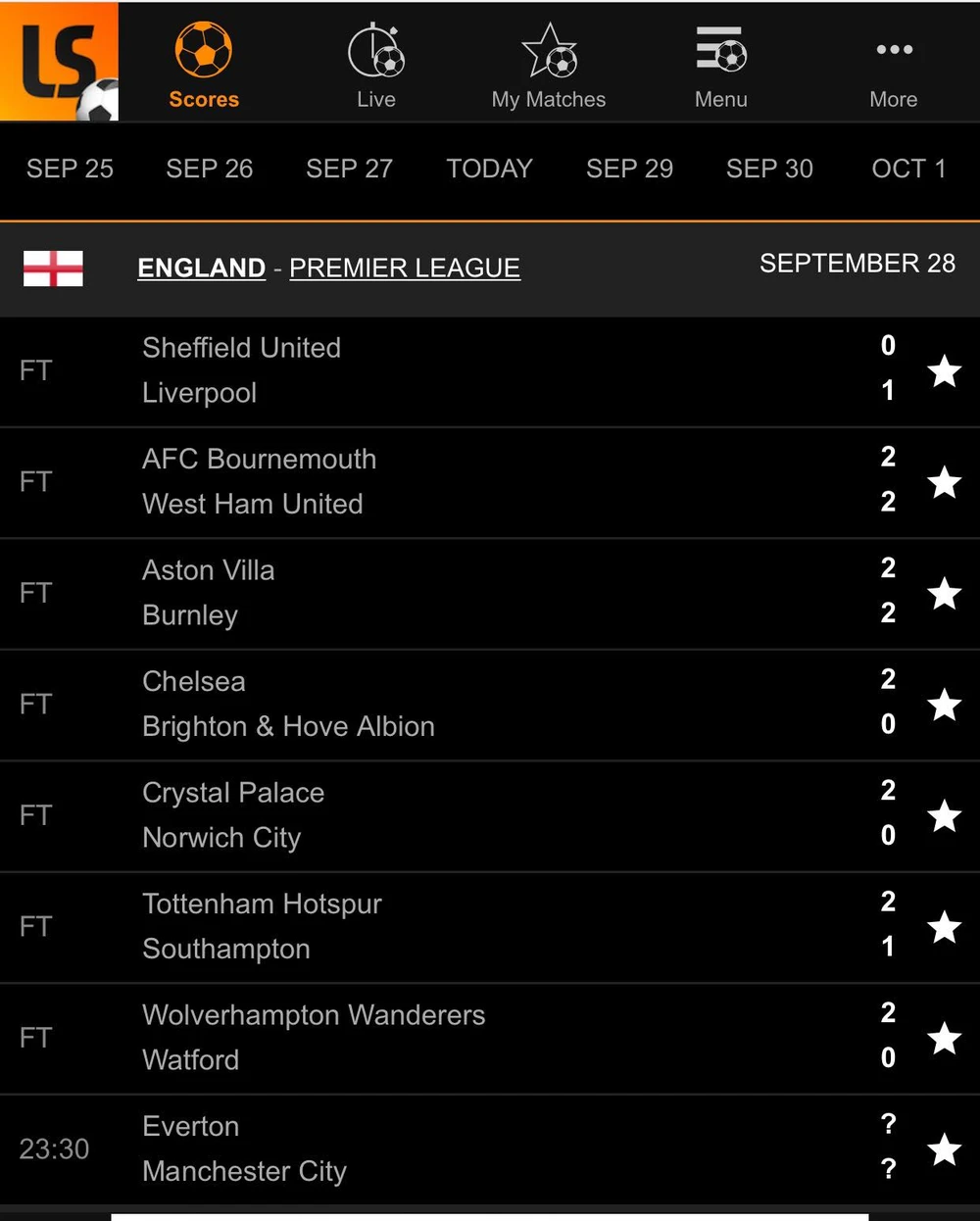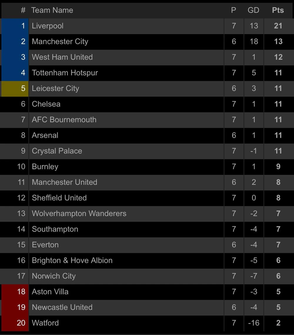 Ở trận đấu cùng giờ, Tottenham cũng giành chiến thắng với tỷ số 2-1 trước Southampton để tạm chiếm vị trí thứ 4 trên bảng xếp hạng khi có cùng 11 điểm nhưng thầy trò Pochettino hơn hiệu số so với các đối thủ cạnh tranh.