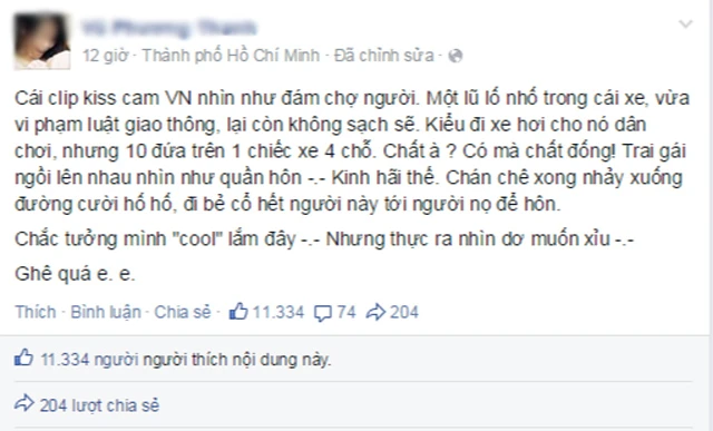 Nhà văn nổi tiếng với nick Gào cũng đã bức xúc chia sẻ trên trang cá nhân của mình: “Kinh hãi thế. Chán chê xong nhảy xuống đường cười hố hố, đi bẻ cổ hết người này tới người nọ để hôn… nhìn dơ muốn xỉu .Ghê quá ẹ ẹ"