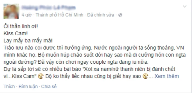 Hay bạn Kim Nguyên (TP HCM) kể trên facebook của mình: "Hôm trước đang ngồi cafe bệt đợi bạn đưa đồ, tự nhiên ở đâu có cái tên lạ hoắc xáp lại đè đầu mình ra hôn. May mà mình né kịp. Rồi tát một tát cho tên bố láo kia. Chửi rõ to: Đồ biến thái. Ai cho phép anh đụng vào người tôi. Anh tên gì, ở đâu. Tôi sẽ kiện anh tội quấy rối người khác nơi công cộng, tội xúc phạm người khác nơi đám đông ... Chưa kịp nói xong thì tên đó bỏ chạy. Hôm nay đọc báo mới biết là có trò Kiss Cam tào lao bí đao gì đó. Mấy bạn nữ hay đi cafe bệt cẩn thận nha. Một trò vớ vẩn, biến thái”