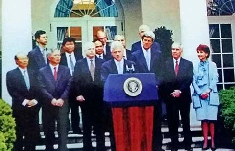 16 giờ ngày 13-7-2000, tại Vườn Hồng, Nhà Trắng, Tổng thống Bill Cliton họp báo thông báo việc ký kết Hiệp định thương mại Việt Nam - Hoa Kỳ. Ảnh: Tư liệu