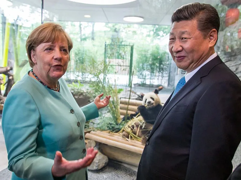 Thủ tướng Angela Merkel (trái) đưa Chủ tịch Tập Cận Bình (phải) đến thăm sở thú Zoo Berlin và gặp một cặp gấu trúc đến từ Trung Quốc, khi ông Tập đến Đức năm 2017. Ảnh: GIANT PANDA GLOBAL