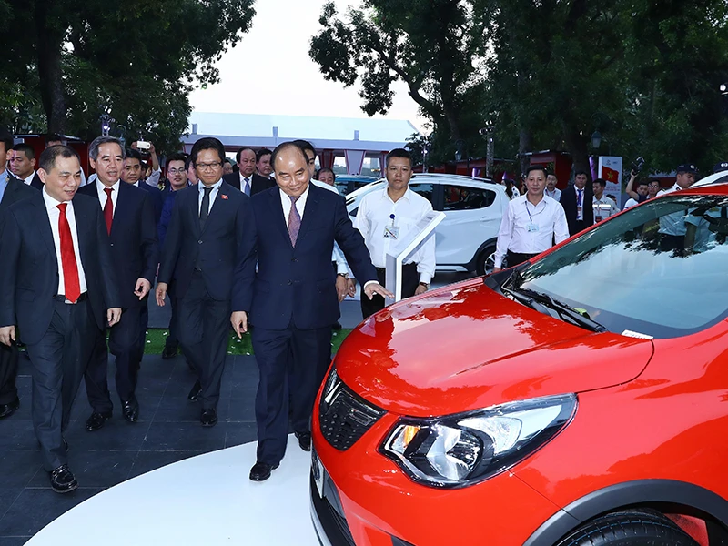 Thủ tướng Nguyễn Xuân Phúc và các đại biểu tham quan mẫu ô tô VinFast của Tập đoàn Vingroup. Ảnh: TTXVN
