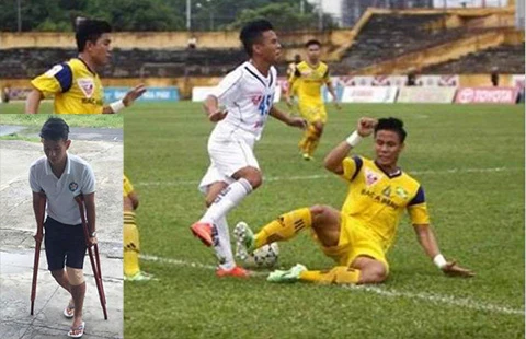 Quế Ngọc Hải (áo vàng, ngồi) đạp bóng vào chân Anh Khoa (áo trắng, giữa) gây chấn thương. Chưa biết chi phí chữa trị cho vết thương của Anh Khoa lên đến bao nhiêu (ảnh nhỏ). Ảnh: CTV
