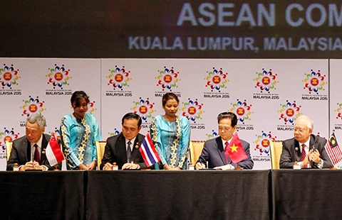 Thủ tướng Nguyễn Tấn Dũng dự lễ ký Tuyên bố Kuala Lumpur về việc thành lập Cộng đồng ASEAN (AC) và Tuyên bố Tầm nhìn ASEAN 2025 . Ảnh: TTXVN