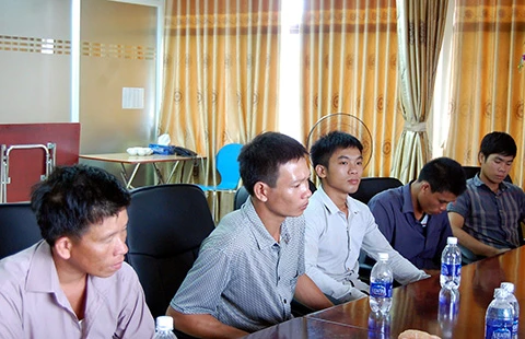 Các ông Thái, Quang, Sơn, Tiếp, Tuyên (từ trái qua) trong buổi làm việc với đoàn giám sát liên ngành tại trụ sở Liên đoàn Luật sư Việt Nam ngày 19-7-2015. Ảnh: C.LUẬN