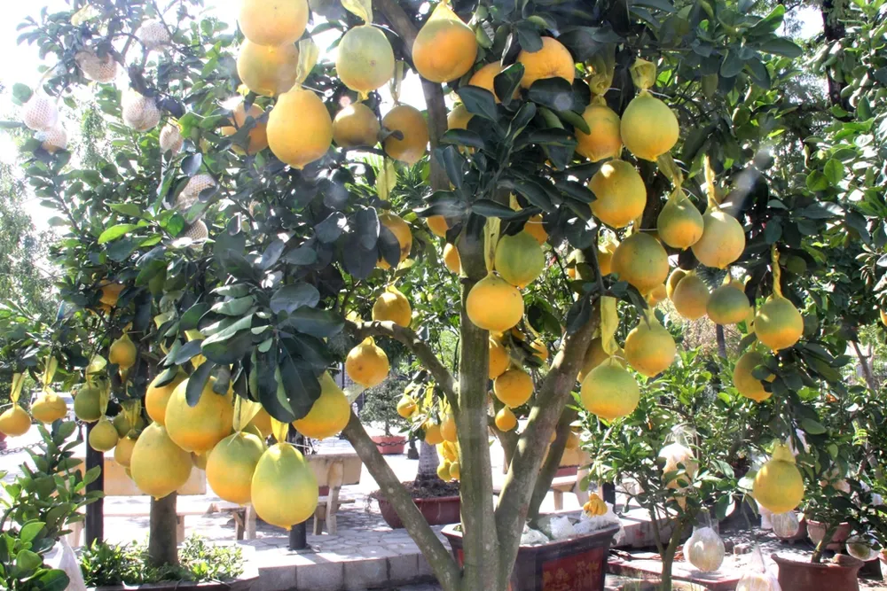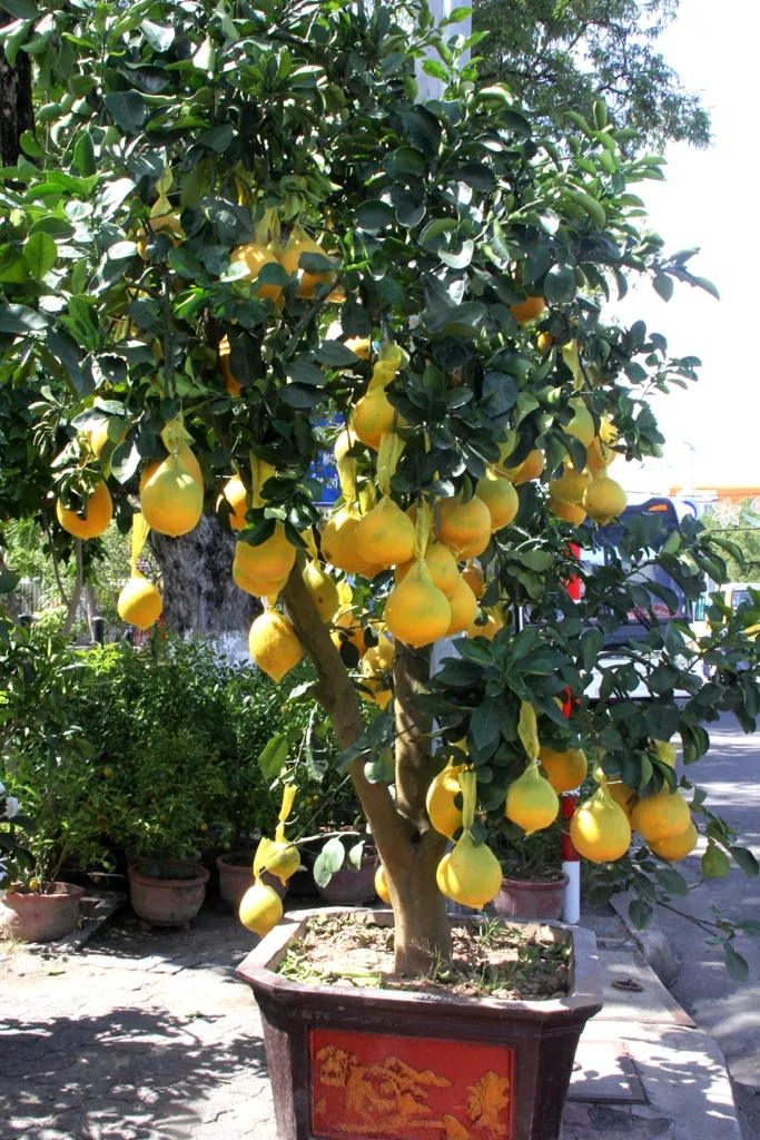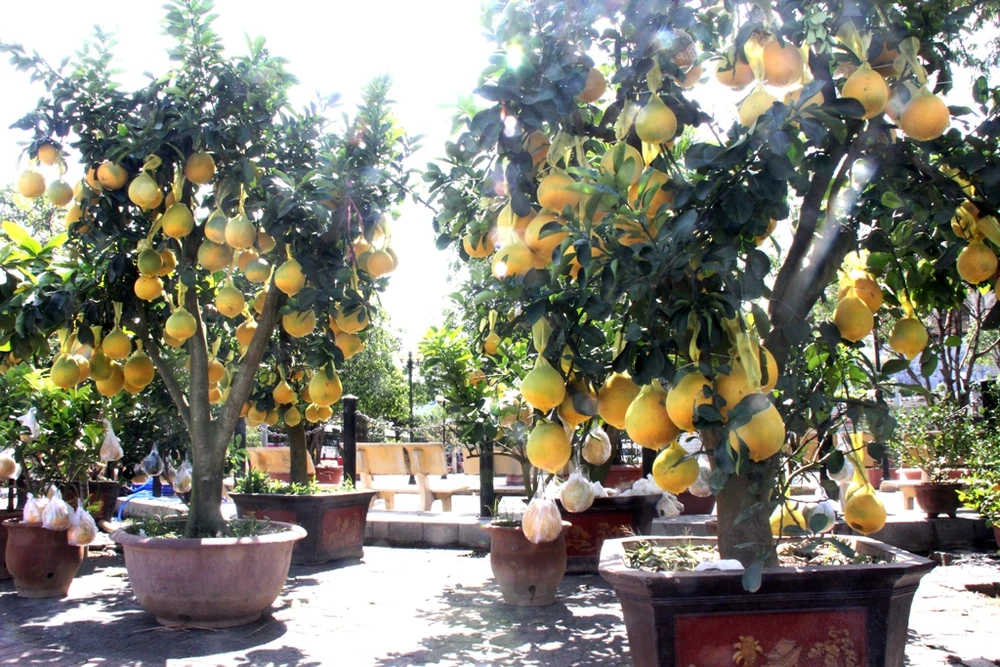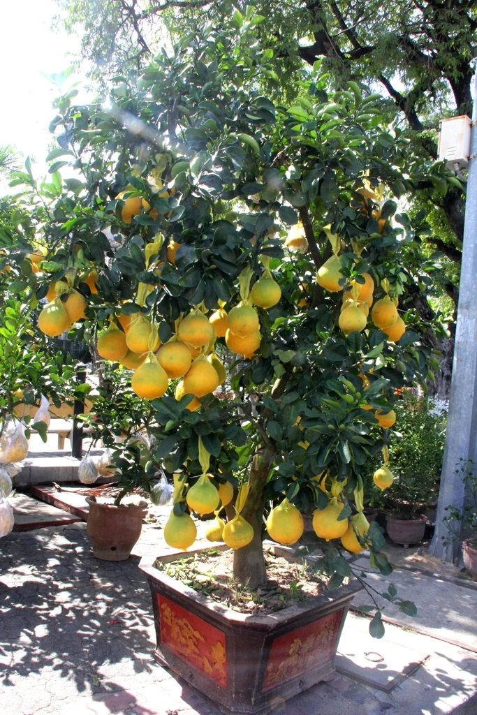 Trưa nay (18-1), rất đông người qua đường phải dừng lại góc đường Thái Nguyên, TP Nha Trang (Khánh Hòa) trầm trồ, say mê ngắm những cây bưởi cảnh trĩu quả màu vàng óng.