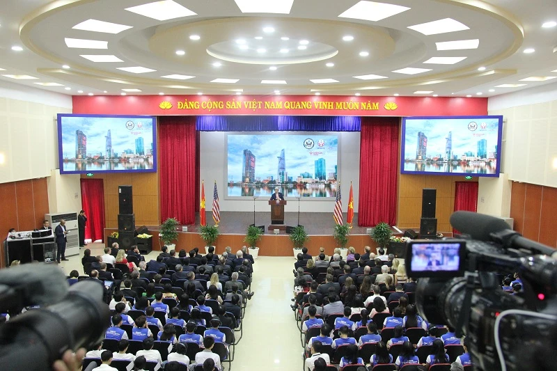 Chiều 13-1, Ngoại trưởng Mỹ John Kerry có buổi trò chuyện với gần 400 sinh viên, trí thức, của chương trình Thủ lĩnh trẻ Đông Nam Á (YSEALI) tại Trường ĐH Sư phạm Kỹ thuật TP.HCM. Trong ảnh: Tiến sĩ Đỗ Văn Dũng, Hiệu trưởng trường Đại học Sư phạm kỹ thuật TP.HCM giới thiệu và chào đón Ngoại trưởng John Kerry.