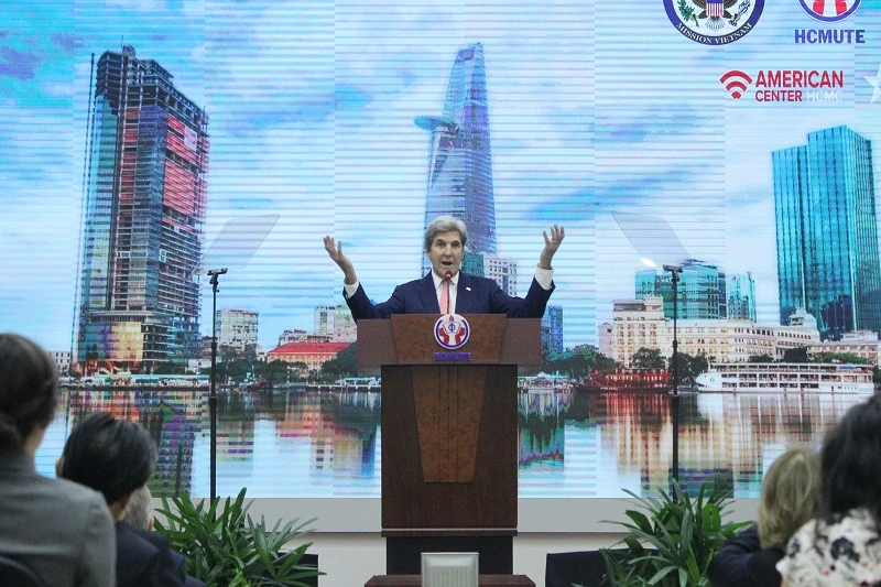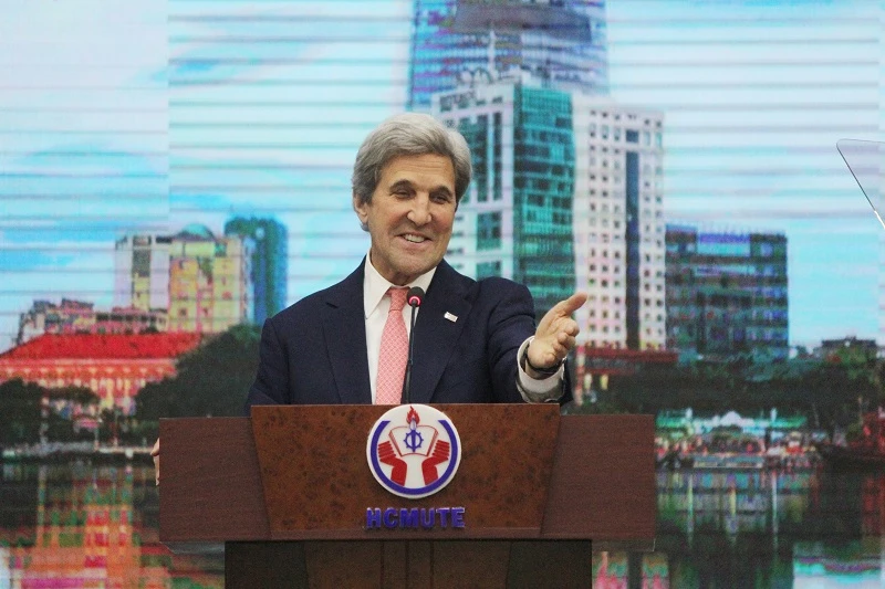 Trước sự chào đón, vỗ tay nồng nhiệt của hàng trăm doanh nhân, trí thức, sinh viên tại hội trường lớn của Trường ĐH Sư phạm Kỹ thuật TP.HCM, Ngoại trưởng Jonh Kerry giải bày: “Không khí trẻ trung trong phòng này biến tóc tôi thành màu nâu trở lại”.