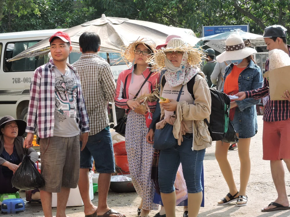 Khách du lịch chuẩn bị lên tàu vào đất liền.