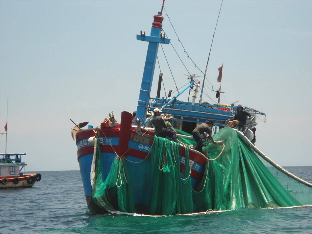 Tàu cá tranh thủ thu lưới sau đêm đánh bắt trên biển.