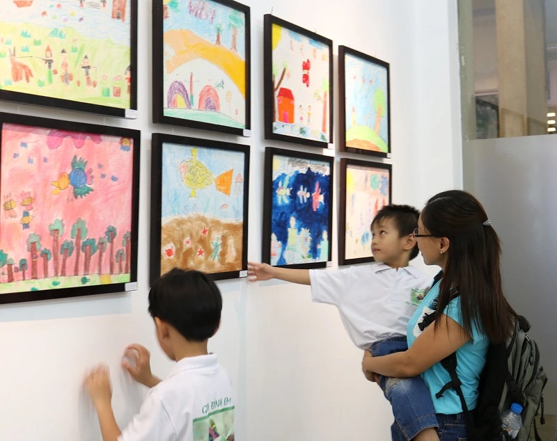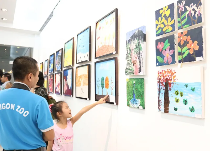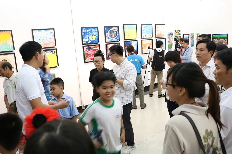 Đông đảo người lớn, trẻ em đến xem triển lãm lần này. Toàn bộ số tiền bán được từ các bức tranh sẽ được dùng để xây dựng quỹ bảo vệ động vật hoang dã. Ảnh: THANH TUYỀN
