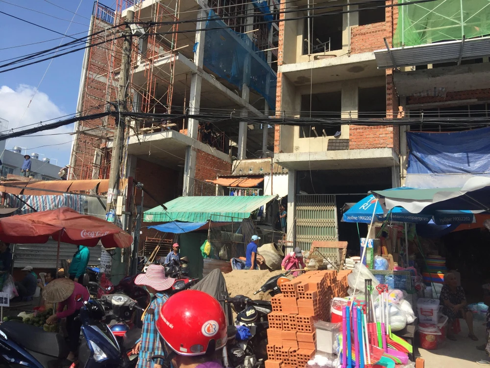 Thậm chí những ngôi nhà đang xây cũng đổ vật liệu như gạch, cát,... ra vỉa hè.
