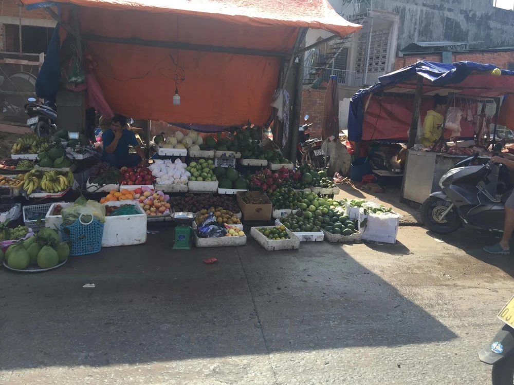 Một trong những sạp hàng bán trái cây bày ra vỉa hè và tràn xuống đường đến hơn 1 m.