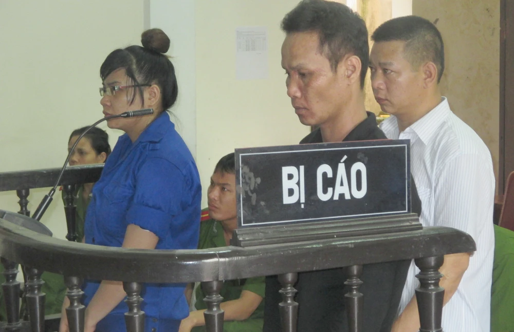 Các bị cáo (từ phải qua trái) Nguyễn Thanh Tâm, Trần Hữu Tuyến, Lương Thị Hương đứng trước vành móng ngựa nghe tòa tuyên án. Ảnh: ĐẮC LAM